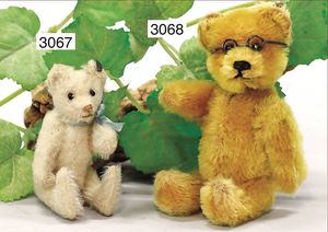 STEIFF Bär, ca. 1930, Kunstplüsch, dunkelbraun, Filztatzen in gutem Zust., lange abgeknickte Arme, 25 cm, Glasaugen, Filzjacke, dazu 1 Steiff Molly, Reste der gelben Fahne, sitzend 9 cm