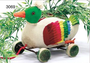 STEIFF Wackel-Ente, auf Exzenterräder, Knopf mit lang gezogenem F, 17 cm hoch, 25 cm lang, Filz, sehr guter Zust., um 1920