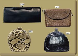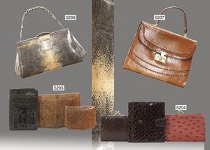 Konv. feines Portemonnaie, 1 x Schlangenleder, goldener Verschluss, 1 Fülltasche, 7 cm x 7 cm, völlig unbenutzt, ca. 30er Jahre, dazu 1 Krokodil-Geldbeutel, mit 2 Druckknöpfen, 1 x Fülltasche für Kleingeld, 2 gr. Geldscheinschlitze, dunkelbraun, 10 cm x 10 cm, völlig unbespielt, 1 x Portemonnaie Straußenleder, silberner Verschluss, Innenfutter rotes Leder, 1 Druckknopf, 2 Geldscheinschlitze, völlig unberührt, 12 cm x 6 cm, sehr schönes Konv.