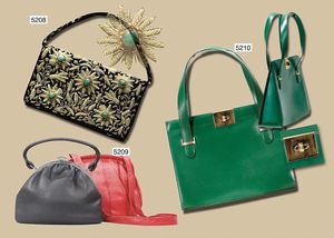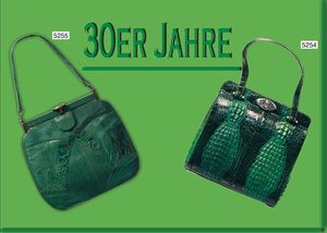 Damenhandtasche, 1935-40, Krokodilleder, grün gefärbt, 2 Trageriemen, Drehverschluß, Silber, Innenfutter Straußenleder, 2 Seitentaschen, 1 Fülltasche, 24 cm hoch, 23 cm breit, 4 Füße, schönes kräftiges grün