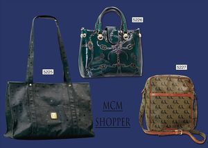 MCM moderner Einkaufs-Shopper, schwarz, Nr. J1556, mit MCM-Emblem auf der Frontseite, Innenfutter Stoff mit gr. Seitentasche, Reißverschluss, MCM-Musterierung, 2 lange Schulterriemen, Länge 45 cm, Höhe 40 cm, schöner ungetragener Zust., neuwertig