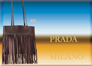 PRADA Milano, flache Kuvertfrom, Aufdruck Prada Milano, lange Schulterriemen, dunkelbraunes leicht geschmeidiges Leder, lange Franzen um die Tasche herum, Zertifikat B4552, gr. geprägtes Logo, Innenfutter weiches, beiges Leder, 1 Seitentasche mit Reißverschluss, Prada-Innenlogo aus 925er Silber, Länge 38 cm, Höhe 30 cm, 80er Jahre, ausgef., in Aufbewahrungssäckchen