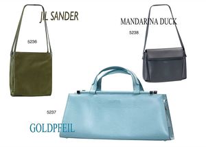 JIL SANDER Tragetasche, oliv, mit seitl. Metallverstärkungen am Trageriemen, geprägt Jil Sander, 2 Schulterriemen, Innenfutter schwarzer Stoff, 3 gr. Fülltaschen, mittig 2 Fülltaschen mit Reißverschluss, seitl. 1 Seitentasche mit Reißverschluss, 26,5 cm hoch, 26 cm breit, in Orig.-Aufbewahrungssäckchen, minm. Gebrauchsspuren
