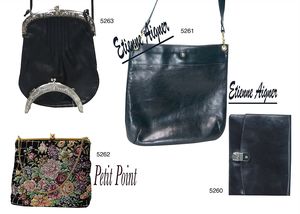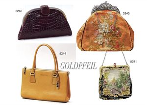 ausgef. Damenhandtasche, ca. 1940, schwarzes Leder, Dreieck geformt, Ledertrageriemen, silberner Verschluss, mit langen Leder-Schultertrageriemen, Innenfutter schwarze Seide, 2 kl. Seitentaschen, mit Riemen 28 cm hoch, altersbed. kl. Abnutzungsstellen an den Ecken sowie am Trageriemen, dazu 1 hochwertig gearbeitete schwarze Abendhandtasche, ca. 1930, hochwertige Arbeit, innen Fülltasche, kl. Seitentasche mit Orig.-Spiegel, 18 cm breit, 22 cm hoch, sehr feines Konv., ausgef.