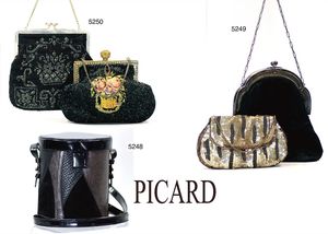 PICARD runde Handtasche, (Hutschachtelform), untersch. Ledermaterialien, 13 cm Durchm., 1 langer Schulterriemen, Größenverstellbar, Magnetknopf, Innenfutter Stoff, ca. 60er Jahre