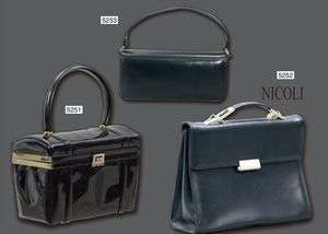 NICOLI moderne Damentasche, dunkelblaues glattes Leder, Edelstahlverschluß, kurzer Trageriemen, Innenfutter glattes Leder, 3 gr. Fülltaschen, 1 Seitentasche mit Reißverschluss, ca. 70er Jahre, 29 cm x 22 cm