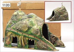 MÄRKLIN Uralt, Tunnel, Blech, handlackiert, passend zu Spur 0, 37 cm lang, mit Weg, Burgruine, seitl. durchbrochen, schöner Orig.-Zust., im Orig.-Karton, mit Fahne
