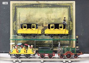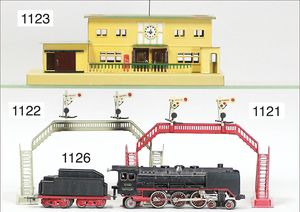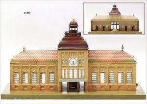 MÄRKLIN kl. Leipziger Bahnhof, 58x28 cm, passend zu Spur 0, Blech, handlackiert, z.T. vorne Bahnsteigüberdachung, Kassenabsperrung, leicht bespielter, guter Orig.-Zust. mit kleineren altersbed. Lackfehlern
