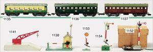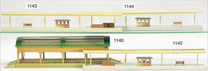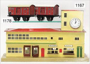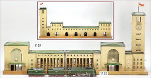 MÄRKLIN Spur 00, 2039 G, 1938/39, kompl., mit Hallenteil und Turmteil, 2038 B, 2039 B, Hallenteil 35,5x20,5x19,5 cm, Turmteil 48x20,5x35,5 cm, im gleichen Farbton, leicht besp. bei wenig Krakrelee-Bildung an den Dächern und kleinen Lackabplatzern, insges. schöner Orig.-Zust.