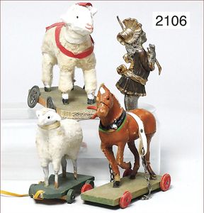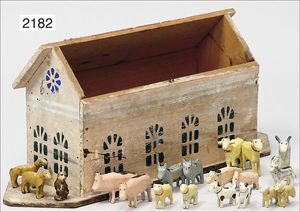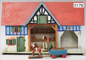 Stall, Manufakturarbeit, Holz lackiert, 56 cm breit, 37 cm hoch, ca. 1910, mit Leiterwagen