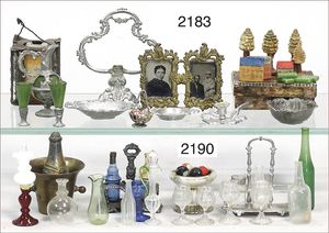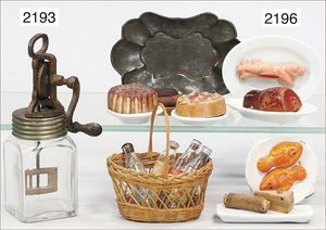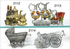 Konv. Ausschmückungsteile für herrschaftl. Puppenstube, 1 x Tablett, Schüsseln, filigran gearbeitet, ca. 13 Teile, dazu Zinn-Essig- und Öl-Karaffe, mit Halter, dazu mehrere Glasteile, Karaffen, Gläser, Flaschen, Salz, Pfeffer und Ölhalter, Zinn, 1 Gefäß fehlt