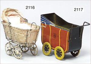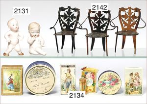 Anziehpuppe, um 1900, Papier lithogr., kl. Stellen ausgebessert, 2 Babyköpfe, Pappe lithogr., 1 Kind im Korb, Pappe lithogr., Kopf getaped