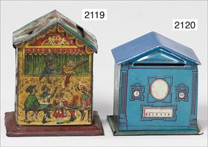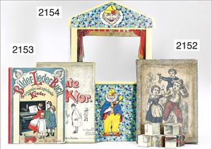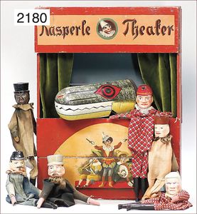 kl. Kasperl-Theater, mit bunt lithogr. Papier beklebt, ca. 1920, 59 cm hoch, 32 cm breit, 18 cm tief