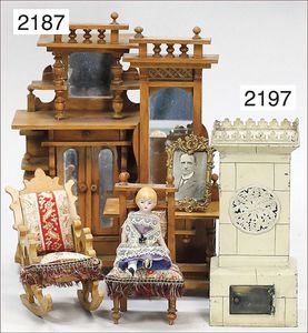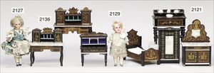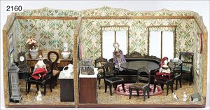 BIEDERMEIER frühe Puppenstube, 2-teilig, 50 cm breit, 20 cm hoch, 27,5 cm tief, 4 Fenster, 1 Fensterglas fehlt, Durchgang, alte Tapete an Wand und Boden, Boden teilw. ausgebessert, möbliert, mit Boulle-Möbeln, Marmorplatte an der Kommode gebrochen, einige Zinn-, Glas- und Porzellanteile, 3 Groednertal-Puppen, schöne Gr.