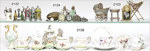 Puppenstuben-Porzellan, Speiseservice, Suppenterrine, Durchm. 10 cm, Sauciere, 3 Platten, 6 flache, 6 tiefe Teller, Durchm. 10 cm, dazu 3 Porzellanteile anderes Dekor, 1 kl. Schale blau/weiß