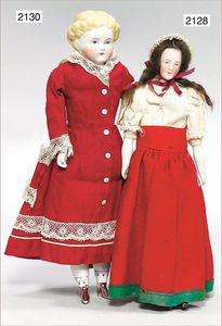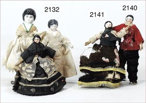 2 Teile Puppenstuben-Puppe, Ganzbiskuit, 9,5 cm, 1 x fester Kopf, 1 x Kurbelkopf, fest eingesetzte Glasaugen, bewegl. Arme und Beine, alte Kleidung
