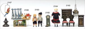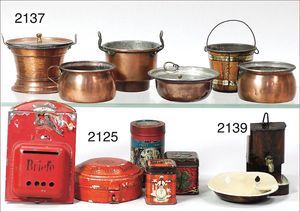 Konv. Puppenstuben-Zubehör, Dekorationsteile für herrschaftl. Puppenstube, meist Zinnteile, Schüsseln, Kaffeekanne, Kerzenständer, Speisetablett, Karaffe, Laterne mit Glaseinsatz, 1 x doppelter Tischbilderrahmen