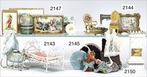 Ausschmückungsteile für herrschaftl. Puppenstube, 1 x Wandbild, Messingblech vergoldeter Bilderrahmen, filigran gearbeitet, 1 Spiegel, Messingblech vergoldet, dazu Muschel-Tischschale, 1 x Tischfigur, dazu 1 kl. Vitrine, Glas montiert, auf Messingblech vergoldeten Füßen, 8 cm hoch, 6 cm Durchm., Zust. 3