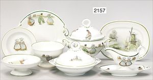 VILLEROY & BOCH ausgef. Kinderservice, 4 tiefe Teller, Durchm. 15 cm, 8 flache Teller, Durchm. 11 cm, 1 gr. Teller, Tablett, Suppenterrine mit Deckel, 13 cm hoch, Sauciere, mit bäuerlichen Motiv, Windmühlen, Häuser, gemarkt 3064 BK