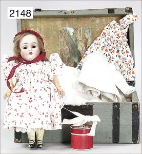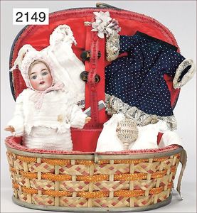 Holz geflochtener Korb, 22 cm breit, 12 cm hoch, innen mit Stoff, dazu 1 Paar Schuhe, Unterkleidung, kl. Kleid, dazu kl. Biskuitporzellan-Kurbelkopfpuppe, JDK, gemarkt 260, blaue Schlafaugen, off. Mund, oben Zähne, Masse-Körper, alte Mohairperücke
