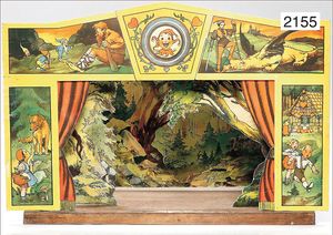 Papiertheater, mit bunt lithogr. Papier beklebt, Kulisse ohne Vorhang, 2 Seitenteile