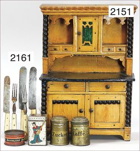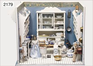 Puppenstuben-Küche, 57 cm hoch, 71 cm breit, 60 cm tief, möbliert, seitl. Regale, unten kl. Vorratsschrank, seitl. Regale, reichh. Zubehör, Keramikteile, Zinnteile, Holzteile, farbl. 1 x überarbeitet, dekorativ