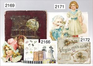Album Deckbild, bunt lithogr., Pappe geprägt, innen jeweils 1 Oblate, Frauenportrait, dazu Einzelteile für Anziehpuppe