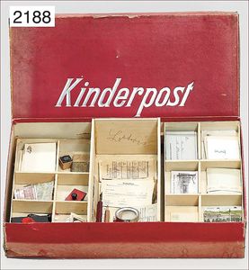Kinderspiel, Kinderpost, ca. 1910, mit versch. Briefen, Briefmarken, Schreibmaterial, Stempel, Kleinteile, im Orig.-Kart., etwas verschlissen