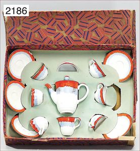 Kinder-Kaffeeservice, wohl 20er Jahre, ausgef. Dekor, blau/orange verlaufend, im Orig.-Kart., Kart. etwas verschlissen, 7 Tassen, 1 x davon etwas bestoßen, Kaffeekanne, 4 Unterteller, 1 x kl. Milchkännchen