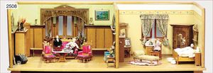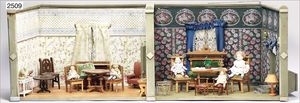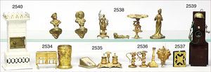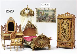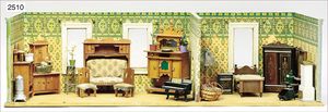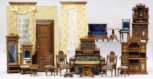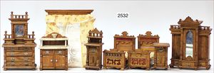 Gründerzeit-Möbelprogramm, Sitzgruppe, Eiche, Schrank, 2 Stühle, 2 Sessel, mit Perlmutt-Einlage, mit Gardinenstangen, 1 Spiegel, Eingangstür, 2-flüglig, 35 cm hoch, 23 cm breit, mit Rahmen, sehr schöner Orig.-Zust.