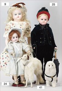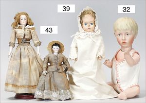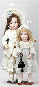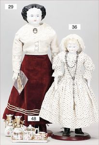2 Porzellan-Brustblatt-Puppen, 1 x Vollkopf, gemarkt 0/5, gemalte Augen, geschl. Mund, Echthaar aufgeklebt, auf neuem Stoffkörper, Porzellan-Arme u. -Unterschenkel, 26 cm, 1 x Biedermeier, Brustblattkopf-Puppe, glasiertes Porzellan, schwarz modellierte Frisur, früher Lady-Lederkörper, abgenähter Daumen, 18 cm