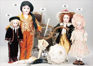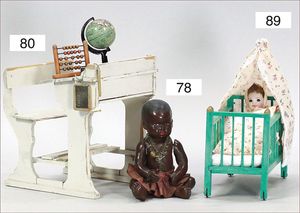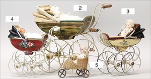 kl. Puppenstubenwagen, Korb, 3 Räder, mit kl. Porzellankopf-Puppe, gemarkt MOA, Max Oscar Arnold, braune fest eingesetzte Glasaugen, off. Mund, Zähne, Mohairperücke, Masse-Stehkörper, mit anmodellierten Stiefeln, 12,5 cm