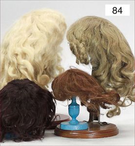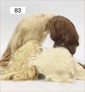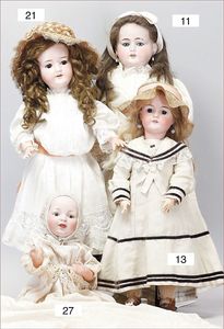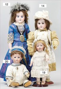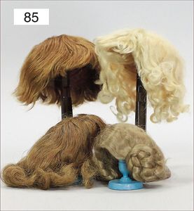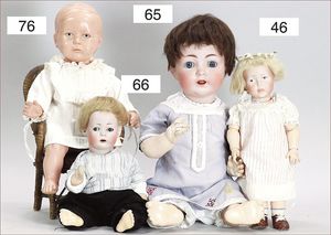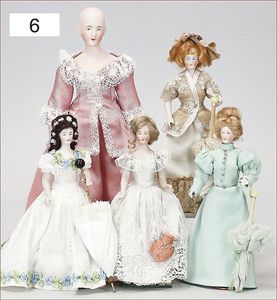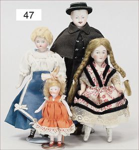 Konv. 4 Porzellan-Puppenstuben-Puppen, 3 x Brustblatt, Stoffkörper, Porzellan-Arme u. -Unterschenkel, zwischen 13 cm u. 16 cm, Porzellan-Puppenstuben-Puppe, bewegl. Arme u. Beine, anmodellierte Schuhe, Mohairperücke, ca. 8 cm
