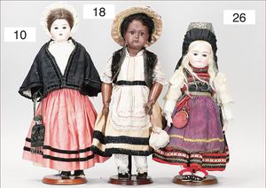 Porzellan-Brustblattkopf-Puppe, mit Kurbelkopf, ungemarkt, Kopf an mehreren Stellen geklebt und ausgebessert, blaue fest eingesetzte Glasaugen, geschl. Mund, alter Korkdeckel, Mohairperücke, Gliederkörper, mit Zwickel, 36 cm, Porzellan-Unterarme, rechter Arm geklebt, alte Trachtenkleidung