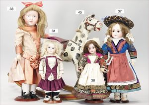 Masse-Brustblattkopf-Puppe, seitl. blickend, blaue Glasaugen, geschl. Mund, Riss an der rechten Schläfe, stellenw. überstrichen, Lippen übermalt, Lederkörper, Stoffarme nachträglich ergänzt, Unterarme Masse, Mohairperücke aufgeklebt, 48 cm, alte Kleidung u. Stiefel mit Absatz
