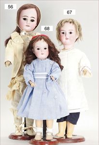 TETE JUMEAU gemarkt Depose 11, Kopf an mehreren Stellen unschön geklebt, graue fest eingesetzte Glasaugen, off. Mund, Zähne, durchst. Ohren, Mohairperücke, auf Masse-Gliederkörper, Brust ausgebessert und übermalt (vormals Platz für einen Mechanismus), Körper stärker bespielt, stellenw. überstrichen, 64 cm, Kleidung aus alten Stoffen genäht