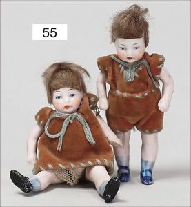 2 kl. Porzellan-Puppenstuben-Puppen, Junge u. Mädchen, bewegl. Arme u. Beine gemalte Augen, aufgeklebte Haare, 9,5 cm, anmodellierte Schuhe u. Strümpfe