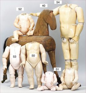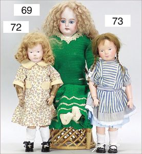 HEINRICH HANDWERCK Porzellankopf-Puppe, gemarkt Germany Halbig 6 1/2, Kopf an mehreren Stellen geklebt u. ausgebessert, braune Schlafaugen, off. Mund, Zähne, durchst. Ohren, Kunsthaarperücke, auf Masse-Gliederkörper, mit Kugelgelenken, 77 cm, linke Hand stellenw. überstrichen, Kleidung alt o. aus alten Stoffen genäht