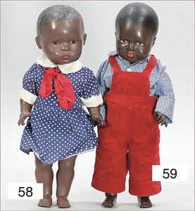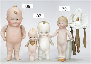 2 Teile Kewpie, 1 x ungemarkt, bewegl. Arme, seitl. blickende Augen, einige Reste von aufgeklebter Perücke, 13 cm, 1 x Kewpie gemarkt Germany, 11 cm