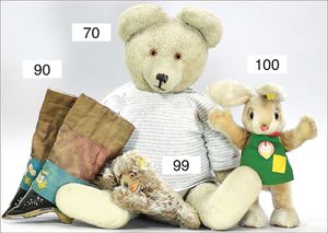 SCHILDKRÖT Hans, gemarkt Schildkröt in Raute 40, blaue Schelmenaugen, etwas Farbabrieb an Stirn u. Nasenspitze, auf Stoffkörper, Stehbaby-Körper, Arme v. Schildkröt Strampelchen, 40 cm, alte Kleidung u. Schuhe