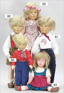 K & R Porzellan-Charakter-Puppe, gemarkt 109, Repro von 1976, gemalte Augen, Echthaarperücke, auf altem Masse-Gliederkörper, mit Kugelgelenken, 56 cm, Kleidung nachgenäht