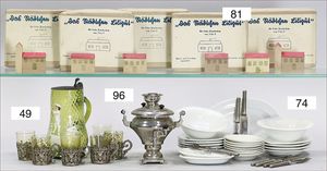 Orig.-Biedermeier-Glaskrug, mit Zinndeckel, mit aufgemalten Kindermotiv, Höhe 13 cm, dazu 6 Gläser, mundgeblasen in Zinnhalterungen, Höhe 5 cm