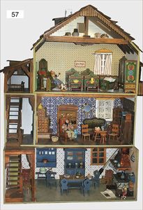 3-stöckiges Puppenhaus, mit Dachboden, Eigenbau, 50er Jahre, Gesamthöhe ca. 1, 30 m, Breite 90 cm, Tiefe 46 cm, mit Treppenaufgang, 3 Räume, Küche, Wohnzimmer u. Schlafzimmer, mit reichh. Mobiliar u. Zubehör