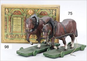 Pferderennspiel, gemarkt "systeme brivite s.g.d.g.", mit einer Laufbahn u. 4 Pferden, Kniehebelantrieb, stärker bespielt, Kleinteile weggebrochen, bzw. fehlen