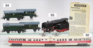 MÄRKLIN DT800, amerikanischer Triebwagen, Guss, elfenbein/rot, 2-teilig, 40 cm, kl. Lackfehler in den Frontbereichen, sonst sehr guter Zust., nur kl. Spielspuren, dazu passende Anleitung