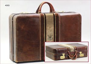 Italienischer Reise- (Hart-)Koffer, passend zu Nr. 4002, braunes weiches Leder, mittig Samteinsatz, an Front u. Hinterseite, 2 Leder-Trageriemen, Messing vergoldetete Verschlüsse, Schlüssel zum Abschließen, Innenfutter Stoff, Ledergurt, 58 cm breit, 17 cm tief, 40 cm tief, 40 cm hoch, unten 4 Füße, kleinere Abnutzungsstellen, sonst gut
