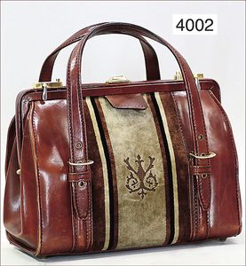 ausgefallene italienische Damenhandtasche, (Hartköfferchen), braunes weiches Leder, mit Samteinlage auf Front und Rückseite verarbeitet, 2 größenverstellbare Trageriemen, mit Schnallen, verschließbar, Innenfutter caramellfarbenes Wildleder, Metallreißverschluss mit Seitenlaschen, 29 cm breit, 23 cm hoch, unten 4 Füße