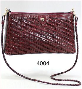 ETIENNE AIGNER Damen-Handtasche, 70er Jahre, brombeerfarben, Frontseite u. Trageriemen geflochten, Aigner-Emblem, Messing vergoldete Beschläge, Innenfutter Stoff, seitl. Kunststoff-Reißverschluss, 30 cm breit, 17 cm hoch, neuwertiger Zust.