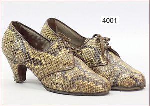 30er Jahre Damen-Schnürschuhe, Absatz abgetreten, Pythonleder, ca. Gr. 38/39, Schlangenlederapplikation an den Schnürsenkeln