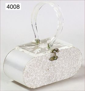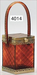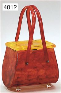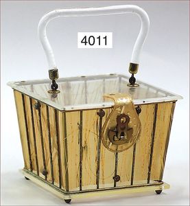 50er Jahre, Plastikbag (LUCITE), bernsteinfarben, 2 Trageriemen, unten 4 Füße, Deckel floral geschnitzt, Messingbeschläge etwas oxidiert, Unterseite bauchig geformt, 15,5 cm breit, 10 cm tief, 14,5 cm hoch, ausgef., sehr schöner Zust.